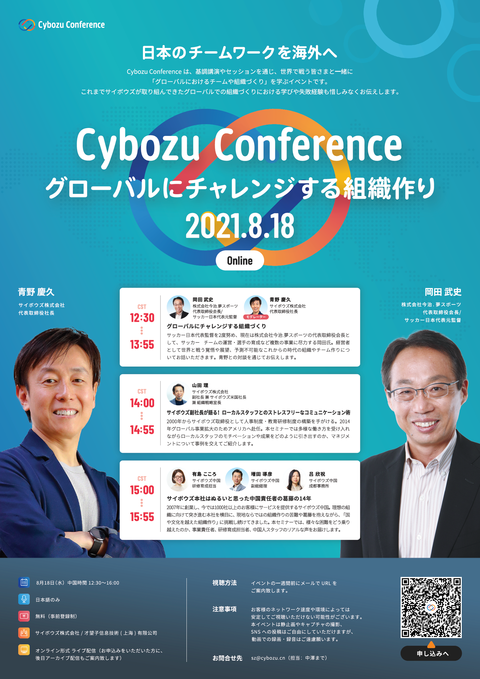 同イベントではサッカー日本代表監督を2度務め、現在株式会社今治・夢スポーツの代表取締役会長である岡田武史氏とサイボウズ株式会社代表取締役社長・青野慶久氏との対談やサイボウズ株式会社副社長・山田理氏が教える「ローカルスタッフとのストレスフリーなコミュニケーション術」などのセミナーを配信する。