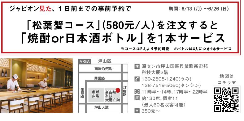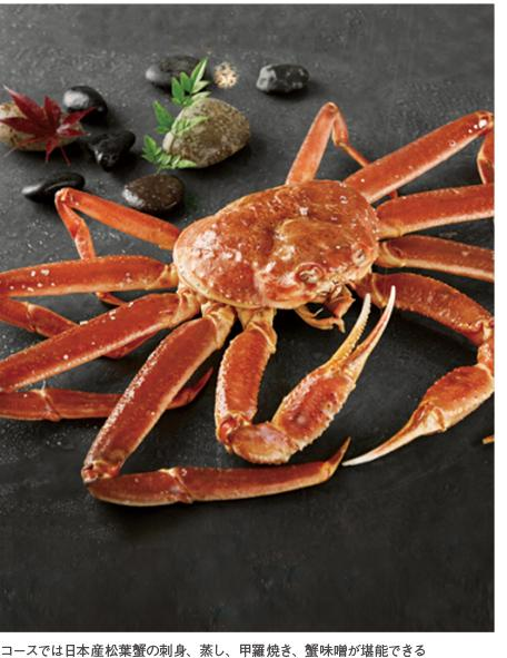 同店の料理長は和の料理人として35年のキャリアを誇る殿山氏。同氏は農林水産省より「日本食普及の親善大使」として任命され、日本食および食文化の魅力を精力的に伝えている。そのような経歴を持つ料理長がオススメするのが、月替わりのコース料理。現在は、7月末まで「松葉蟹コース」(580元/1名)を用意。「蟹味噌豆腐」や「蟹の刺身」、「蒸し蟹」、「蟹の甲羅焼き」など、日本産松葉蟹が堪能できる全10品の贅沢なコースとなっている。
