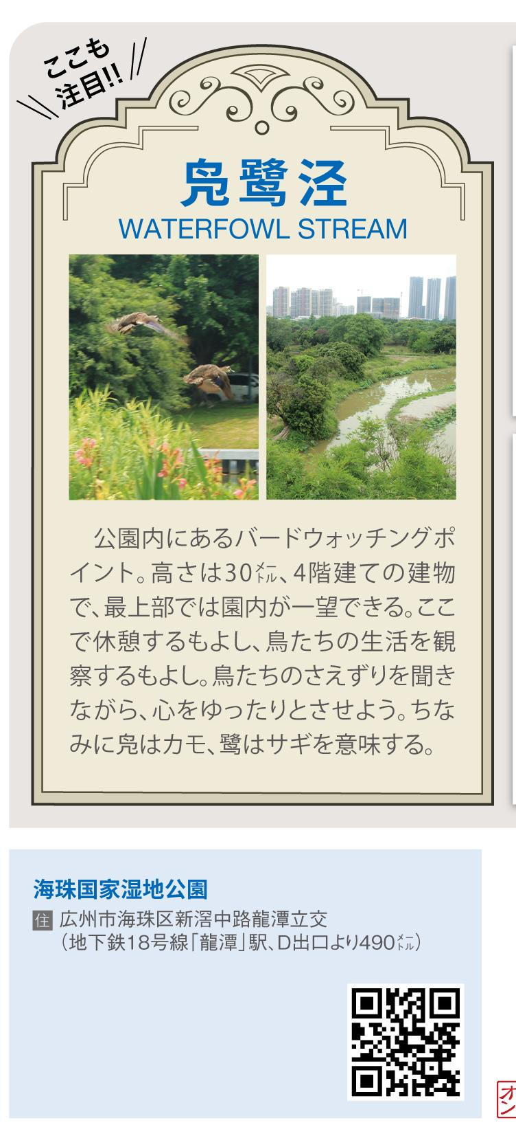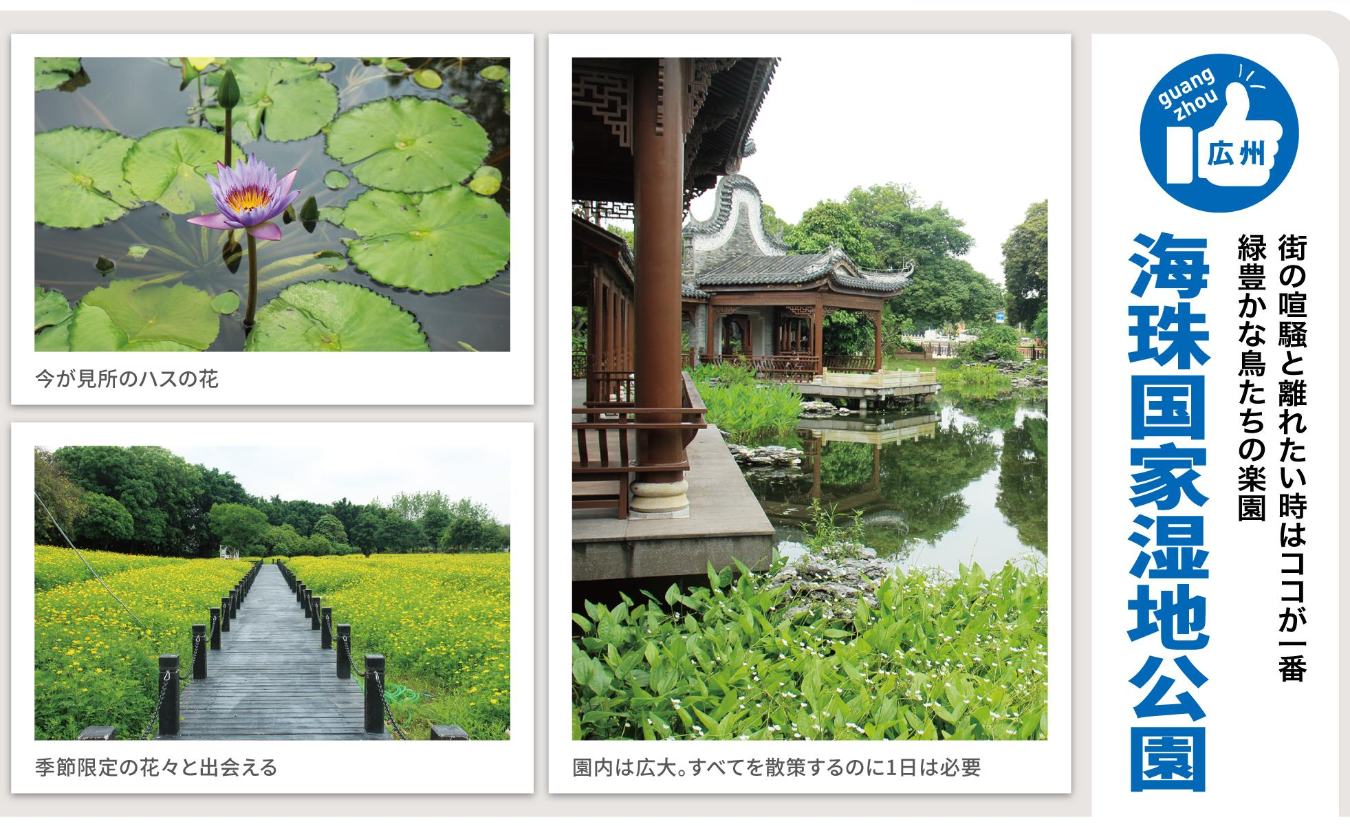 敷地面積は東京ドームの235個分。「世界最大の都市型湿地公園」と謳われ、中心区から車で20分で行ける都会の癒しスポットがこの「海珠国家湿地公園」だ。園内には835種の植物、183種の鳥類、535種の昆虫、60種の魚類が暮らしており、多種多様な生態系を形成している。