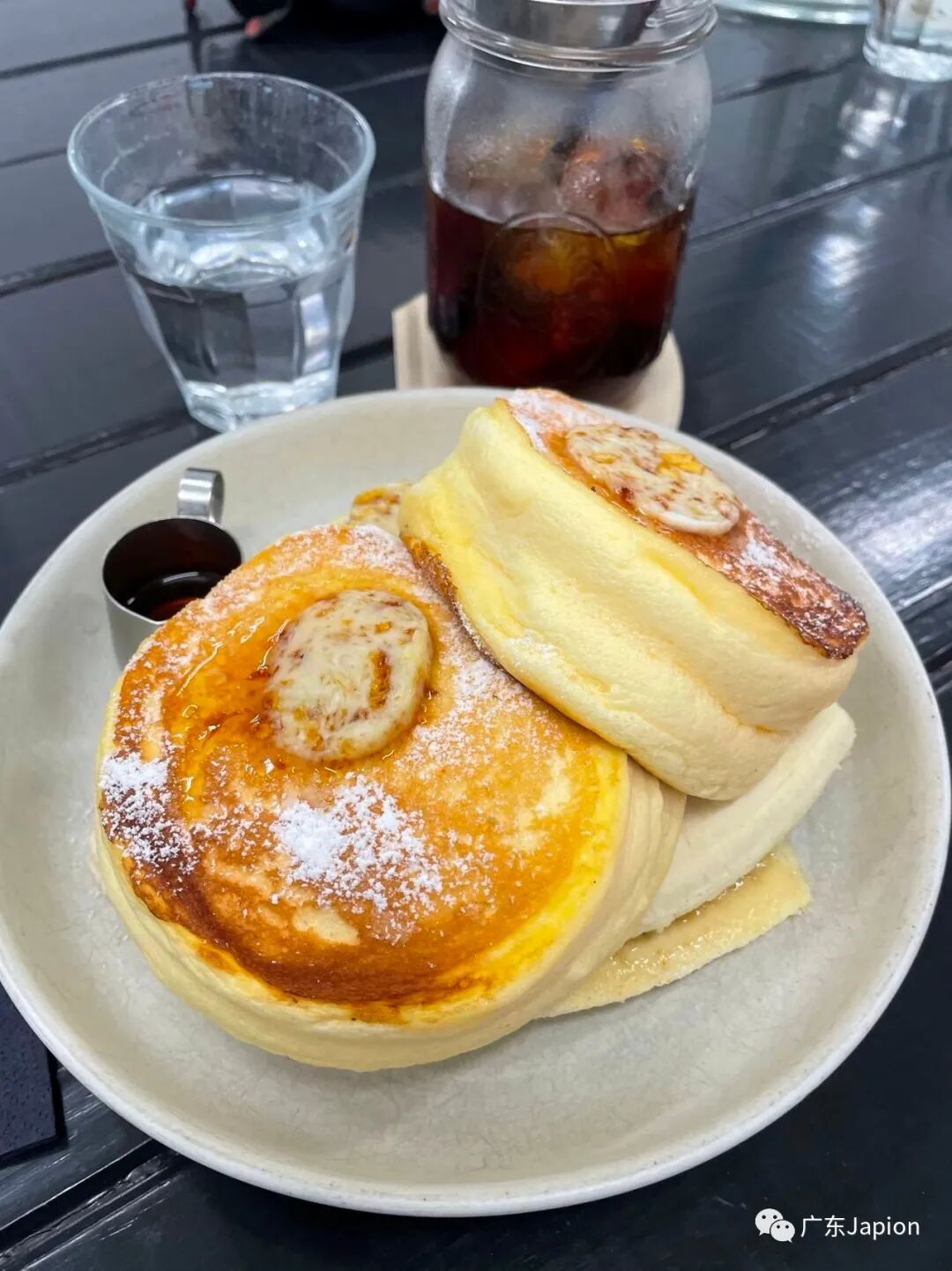 このカフェの看板メニューは、自家製リコッタチーズと自家製ハニーバターを使ったパンケーキ「義大利芝士松餅(リコッタパンケーキ)」(96元)。生地がフワフワなのはもちろん、ほどよい甘さと酸味が感じられるのが高評価やな。シンプルな盛り付けでまさに「大人なパンケーキ」と言っても過言でない。一度食べたらヤミツキになる人もいるんちゃうんかな。ワンプレートに3枚パンケーキがあるので、シェアしながら食べるといいで。ただこのカフェ、パンケーキがこの1種類しかないのは残念…。ほかの味のパンケーキも食べてみたかったわ。