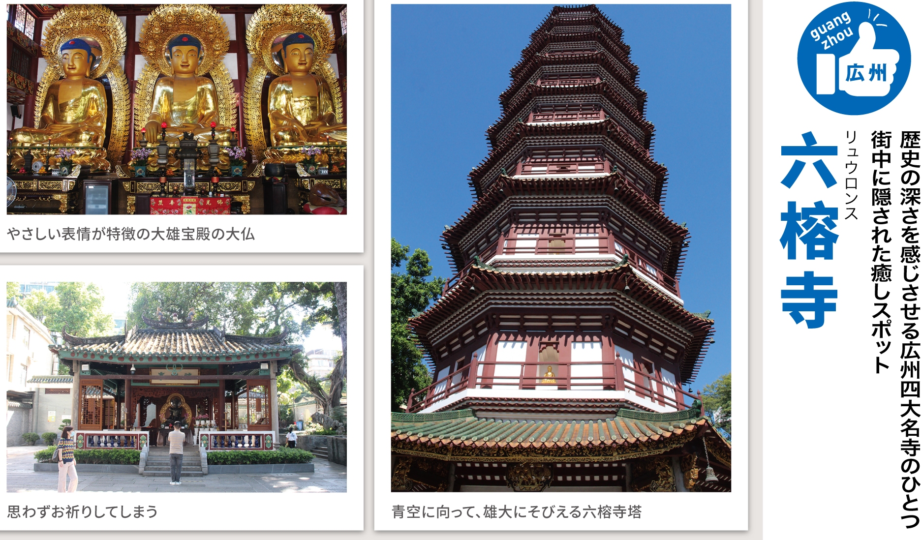 1400年もの歴史を持ち、「広州十大旅行景点」にも選ばれている「六榕寺」。見所は寺の中央にある「六榕寺塔」。高さ57㍍を有し、その姿は雄大で思わず見とれてしまう。コロナ禍以前は入塔できたようなのだが、残念なことに現在は塔内に入ることができなくなっている。また境内にある「大雄宝殿」には、広東省で最も大きいとされている三体の銅像が鎮座。少し愛くるしい表情に心癒されるであろう。