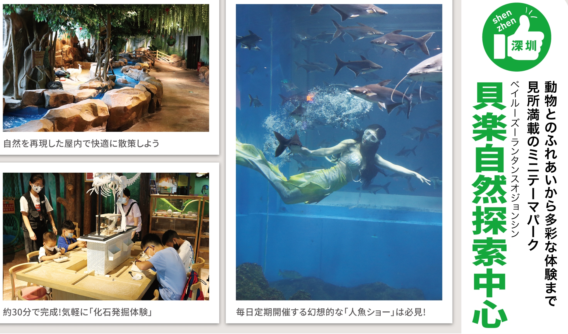 魚類の展示や動物とのふれあい、餌やり、生態解説など、動物を間近に感じられる様々な体験コーナーのほか、ダイビング体験やクラフト教室などの多彩なプログラムが用意されたテーマパーク。館内は3つのエリアから成り、1つ目は熱帯魚やクラゲなどの水槽やアシカショー、人魚ショーを開催する「海洋館」。2つ目はウサギやミーアキャット、アルパカ、ヤギ、ミニ豚などの動物や鳥類、爬虫類などの展示や餌やり・ふれ合い体験、生態解説のほか、ハンドクラフト教室を設置する「萌寵館」。そして3つ目はお化け屋敷やミラーハウス、SNS映えする空間などが用意されたユニークな「探奇館」で構成されている。