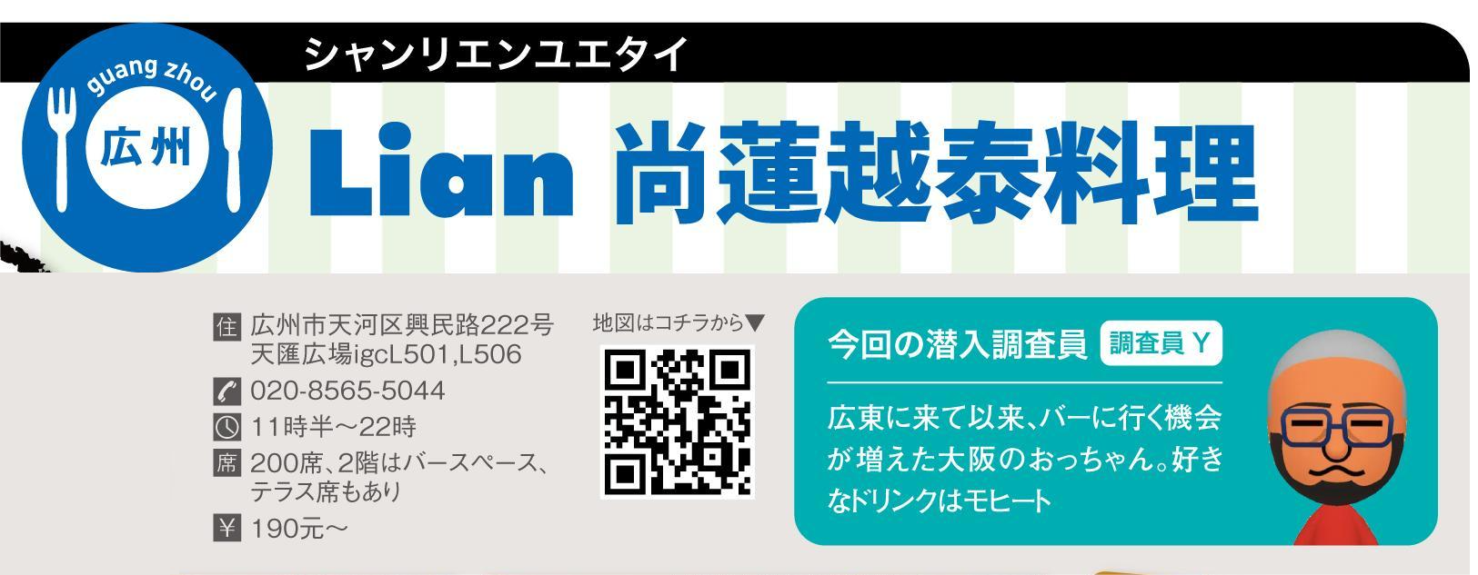 今月はショッピングモール「IGC天匯」5階にあるベトナム&タイ料理レストラン「Lian」に行ってきたで~。ここはグルメサイト「大衆点評」の「必吃榜(必ず食べたいランキング)」に選ばれたことがある有名店。オリジナルのベトナム&タイ料理が楽しめると人気を集めているようやな。