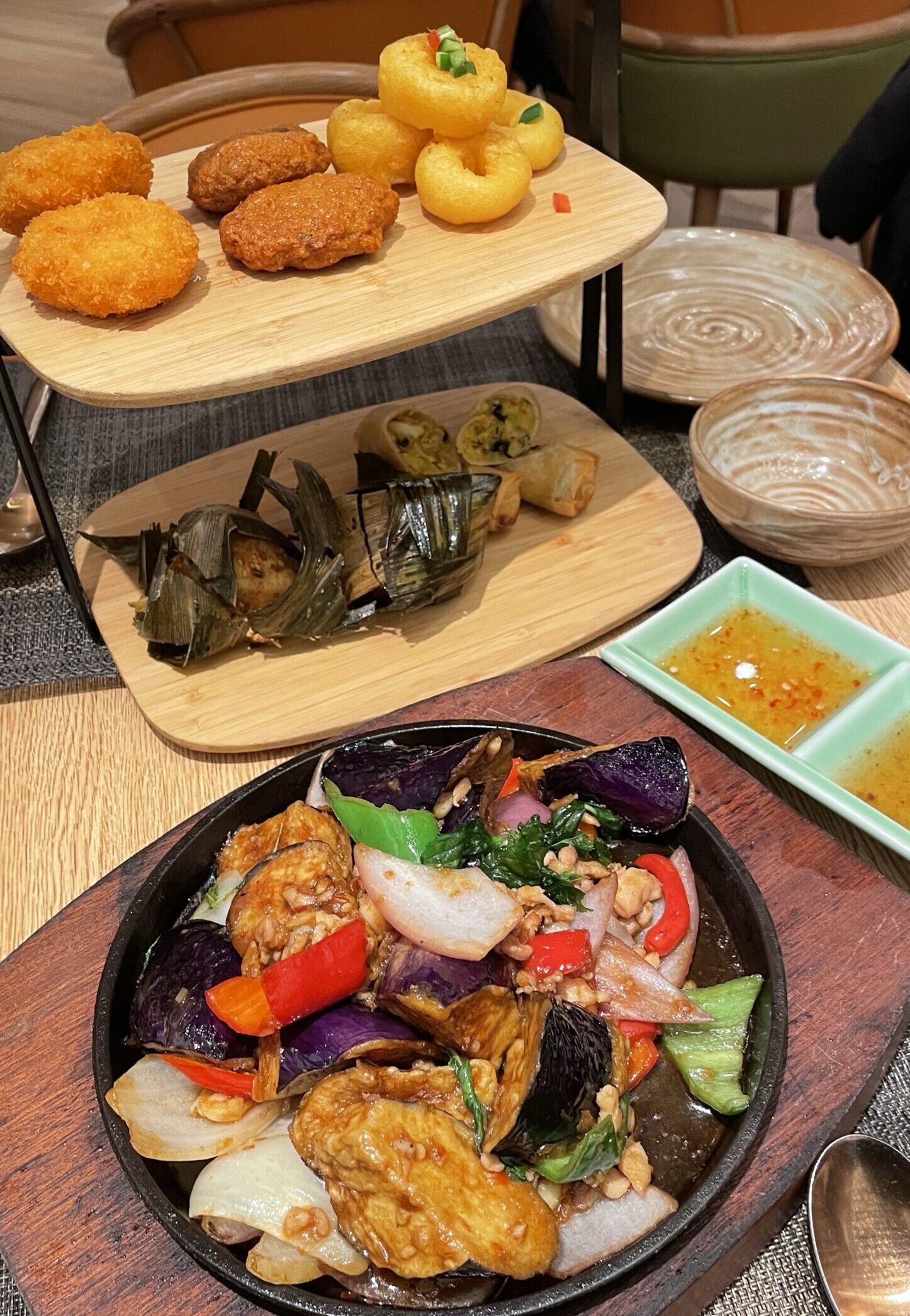 さて、ここでは「トムヤンクン」などの定番タイ料理だけでなく、中華エッセンスが入ったオリジナルタイ料理も楽しめるんや。「これもあれも食べたい」と豊富なメニューの中から、わてが選んだのは「トートマングン(エビのすり身揚げ)」、「タイ風イカフライ」、「タイ風春巻」など6種類のおつまみが味わえる「泰式小食拼盘」(148元)とナスと鶏ひき肉を唐辛子とニンニクで炒め、ナンプラーで味付けをした「鉄板香辣鶏肉碎茄子」(68元)。小食拼盘はご飯のお供と言うより酒のアテと言うべきメニュー。ビールを飲みながらいただくと懐かしのプーケット旅行を思い出すわ。一方、鉄板料理はご飯がガンガン進む一品。茄子にはナンプラーなどの旨みがしっかりと沁み込まれていて、箸が止まらなくなってまう魔性の料理で、ニンニクの香りが食欲を刺激し、お茶碗1つだけじゃ、ご飯は足りひんな。