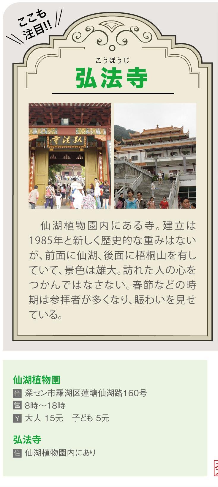 仙湖植物園は市内より意外と近く、地下鉄「羅湖」駅より地下鉄で約40分ほどで到着。広大な敷地を誇り、園内には約8000種類の植物が栽培されており、休日になると、多くの深セン市民が訪れる都会のオアシス的なスポットだ。同植物園の目玉はやはり中央にあり、広大な面積を有する「仙湖」であろう。湖にはボート乗り場があり、雄大な仙湖をボートに乗って満喫することができる。また仙湖植物園には「棕櫚園(ヤシの木園)」、「竹園」、「盆栽園」など、植物ごとに分類されたエリアが多数存在。季節に応じて、様々な風景を見せてくれる。