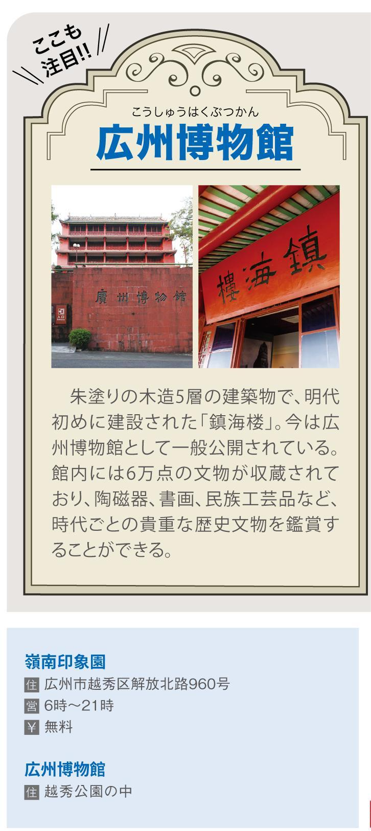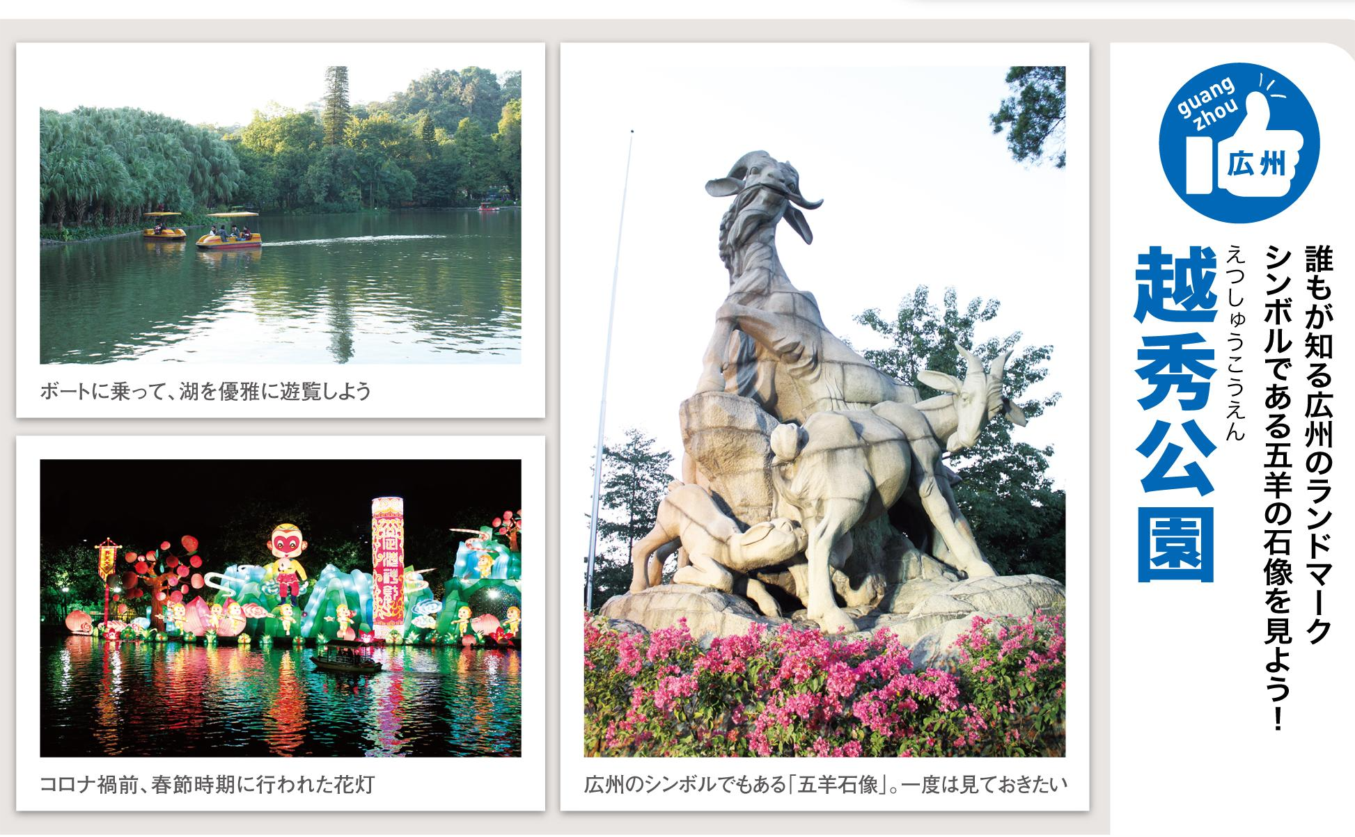 越秀公園は6つの丘からなる広州市最大の公園。季節ごとに様々なイベントが開催されており、春節前後に開催され、今年の干支をモチーフにした灯篭が多く登場する「花灯(灯篭祭り)」は、広州を代表する行事である。また園内には人口湖があり、そこでは貸しボートに乗ることができる。今からの季節、子どもと一緒にボートに乗りながら湖を遊覧するのもいいのではないだろうか?