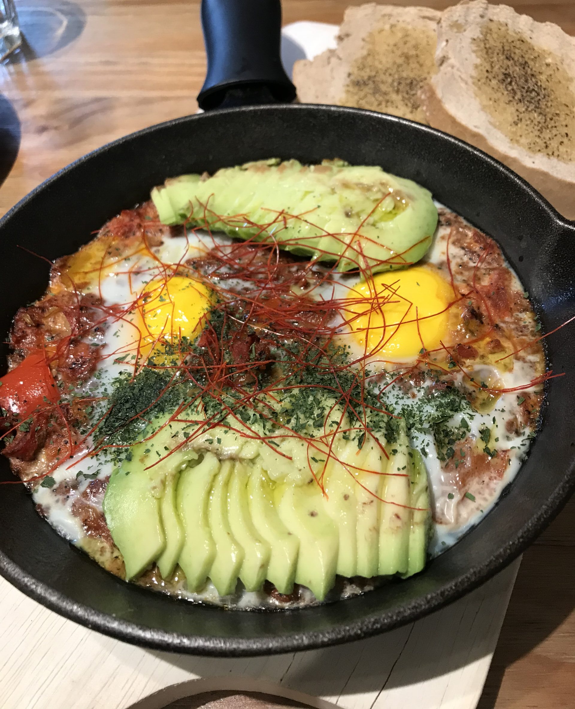 そのようなオシャレ感溢れるカフェに白髪坊主のおっさんが訪れたのは昼前の11時頃。若いカップルが1組、奥の席でコーヒーを飲んでいたので前側の席に座る。机にあるQRコードをスキャンし、何を食べようかを見ていると、イスラエル料理「チョリソー・シュクシャカ」(78元)にめっさ興味が惹かれたんで、それを注文したんや。オリーブオイルで炒めたニンニクや玉ねぎをトマトソースで包み込んで中央に目玉焼きを乗せたメニュー。スパイシーな味わいが酒好きのおっさんの好みにマッチ。付け合わせのフランスパンに付けて食べると、パクパクいただけてまうで~。
