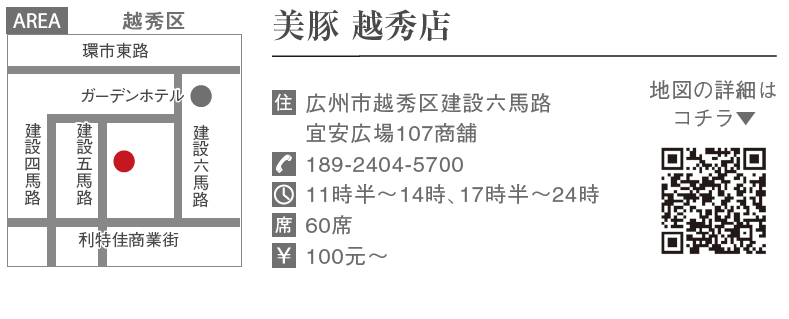 生まれ変わった越秀店のウリは店の広さ。旧店と比べ、席数が大幅にアップし「ちょっと狭く、落ち着けないな~」と思われていた越秀店のイメージを払拭してくれた。また料理は「トンカツ」や「トンテキ」の豚メニューはもちろん、豚骨スープベースの「美豚ラーメン」など、これまで愛されているメニューは健在。しかも「イベリコ豚のアツアツ鍋」(118元/2人前)のような季節限定メニューが登場し、幅広い客層に愛されるメニュー作りを心がけている。