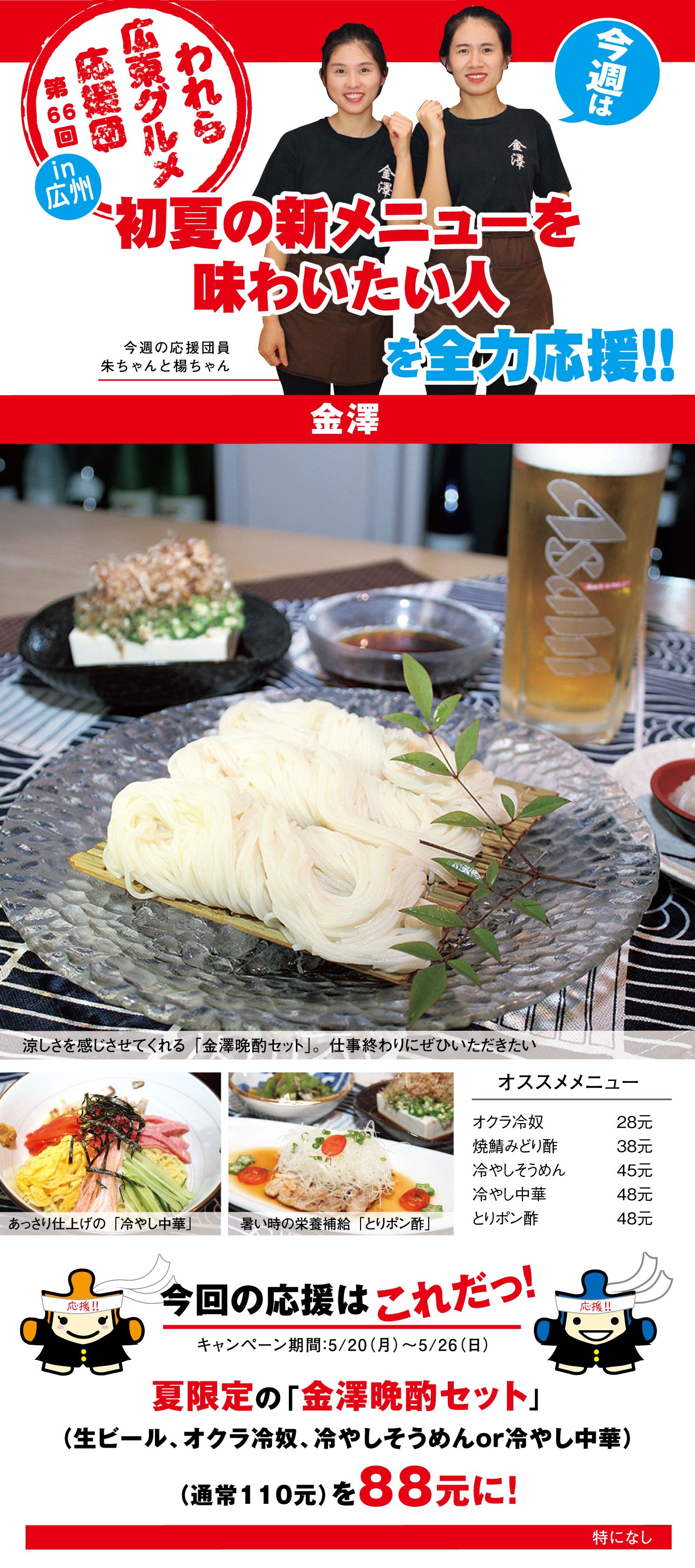 今週もやって来ました広東グルメ応援団。今回応援団に加わってくれたのは、日本料理店「金澤」だ。
