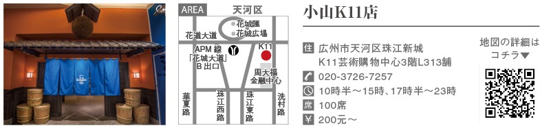 アートをテーマにしたショッピングモールK11にオープンした日本料理店「小山」。北京、上海、深センなど中国各地で店舗展開をする有名日本料理店で、寿司や天ぷらなどの本格的な和食を提供している。さらに、同店にはこの道20年の日本人料理長が在籍。これまで培ってきた経験を遺憾なく発揮し、和食通たちを唸らす一品料理を届ける。