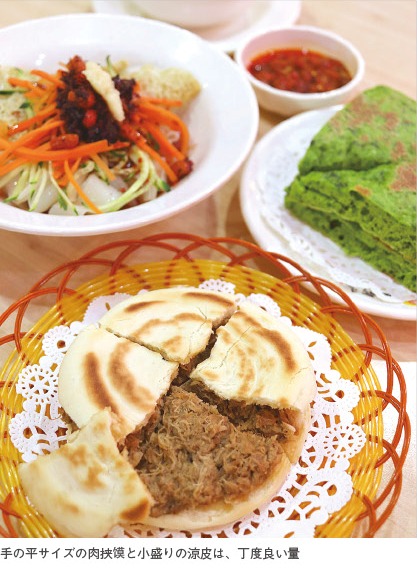 ここは、「西北菜」が楽しめるレストラン。麺料理や肉料理が充実しとって、周辺の会社員風男女で賑わっとったばい。私は早速教えてもらった「王福記腊肉挟馍(ロウジャアモ)」(15元)と「西北涼皮(リャンピー)」(12元)を注文。肉挟馍は、当初想像しとった味わいとは違い、意外とアッサリした味ばい。よう煮込まれた豚肉は脂っこくなく、香りも最高ちゃ~。外側に焼き色がついた素焼きの白パンは、表面がサクサクで薄くてこまいけ、ペロリち食べられたばい。つるんちしたモチモチ食感の涼皮は、パンチのある焦がしニンニクラー油が効いてばりスパイシーっちゃ! ピーナッツとキュウリがアクセントになって、よかね。この冷たい麺は、これからの暑い季節にピッタリばい。