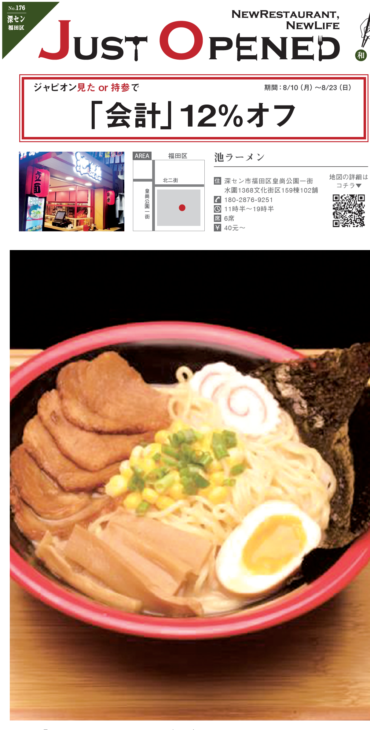 広州の人気ラーメン専門店が深センにやって来た! 福田区、オシャレなバーが集まる皇崗公園の中にオープンした「池ラーメン」。大人気の5枚のドでかチャーシューに豚骨ベースのあっさりスープが旨さの秘訣である「大満足チャーシューラーメン」(38元)に、広州の若者から支持を集める「カレーラーメン」(42元)や「チーズラーメン」(38元)などの様々なテイストのラーメンを用意。ご飯時になると、多くの人が池ラーメンのラーメンを求め、やって来る。