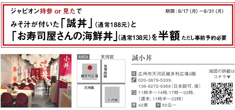 広州で人気を集める寿司が看板メニューで日本料理店の「誠寿司」が、7月下旬より、維多利広場3階でどんぶり専門店「誠小丼」をオープンさせた。同店は「リーズナブルで美味しいどんぶりを届ける」ことをコンセプトに、「鶏南蛮丼」(48元)や「豚丼」(55元)など、バラエティー豊かなどんぶりを届ける。