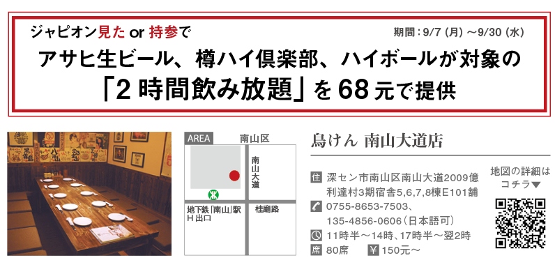 広州に住んでいる人なら誰もが知っている「鳥けん」。同店は山口県・秋川食品と独占契約し、大自然の中、無投薬飼育で育てられた秋川鶏を取扱う焼鳥専門店で「焼鳥はどれも大振りで食べ応え満点」と人気を集める。そんな人気焼き鳥店が7月中旬、地下鉄「南山」駅より徒歩5分の所に新店舗をオープン。日々、多くの人で賑わっている。