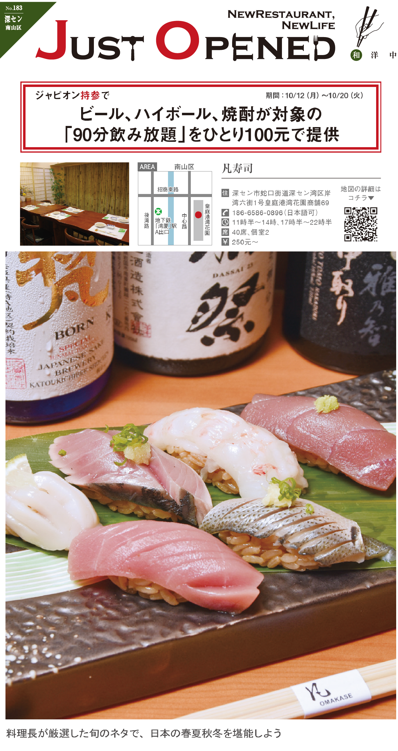 本格江戸前寿司を楽しもう。南山区、皇庭港湾花園にオープンした江戸前寿司と呑み処「凡寿司」。この道十数年の料理長が厨房に立ち、日本や近海から取り寄せた旬のネタを振舞う。今の時季なら太刀魚、ブリ、カニなどがオススメ。コクとまろやかさを引き立たせる赤シャリとのハーモニーを楽しんでほしい。
