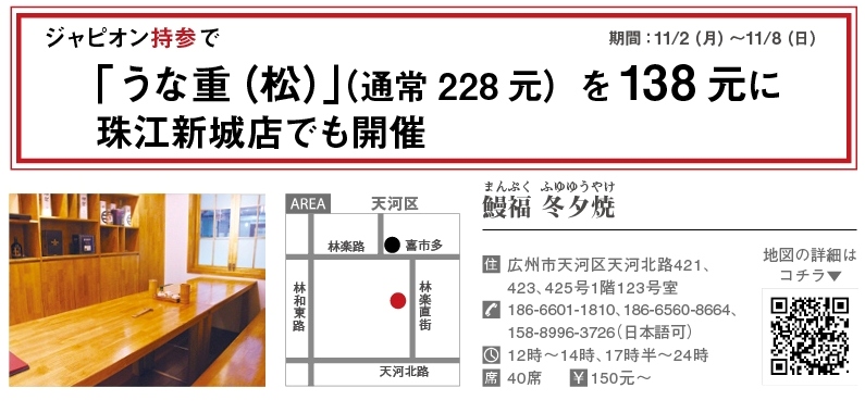 珠江新城の人気日本料理店が天河区にやって来た。炭火を使い、秘伝のタレをつけて丁寧に焼き上げた「蒲焼き」や、鰻本来の美味しさが楽しめる「白焼き」(各、上・158元、極上・218元)など、活鰻を使った鰻メニューが看板料理の日本料理店「鰻福」。そんな同店の2号店「冬夕焼」が10月1日(木)、林楽路付近にプレオープン。多くの人で賑わっている。