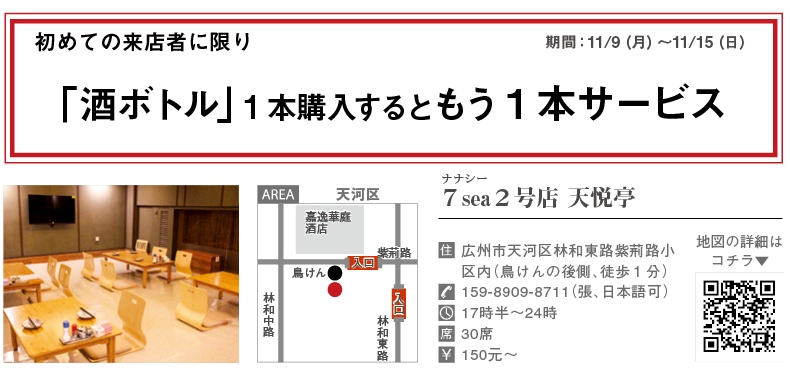 そんな同店の2号店が10月10日(土)、地下鉄「広州東」駅より徒歩5分、紫荊路の小区内にプレオープン。1階にカウンター席、2階に座敷を完備し、1号店より席数が多く、広々としているのが特長だ。また、同店の看板メニューは、この道十数年の職人が、旬の食材を使って揚げる絶品天ぷら。「盛り合わせ」(58元~)だけでなく「単品」(20元/3個)でも注文が可能なので、好みの具材を気軽に味わえると、飲兵衛たちから喜ばれている。