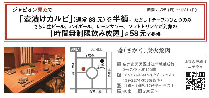 珠江新城の浜焼き専門店「磯貝」附近に、1月18日(月)、炭火焼肉専門店「盛(さかり)」がオープン。店内は全40席でテーブル席と3つの個室が完備されており、4~6人までの会食などに重宝しやすい。