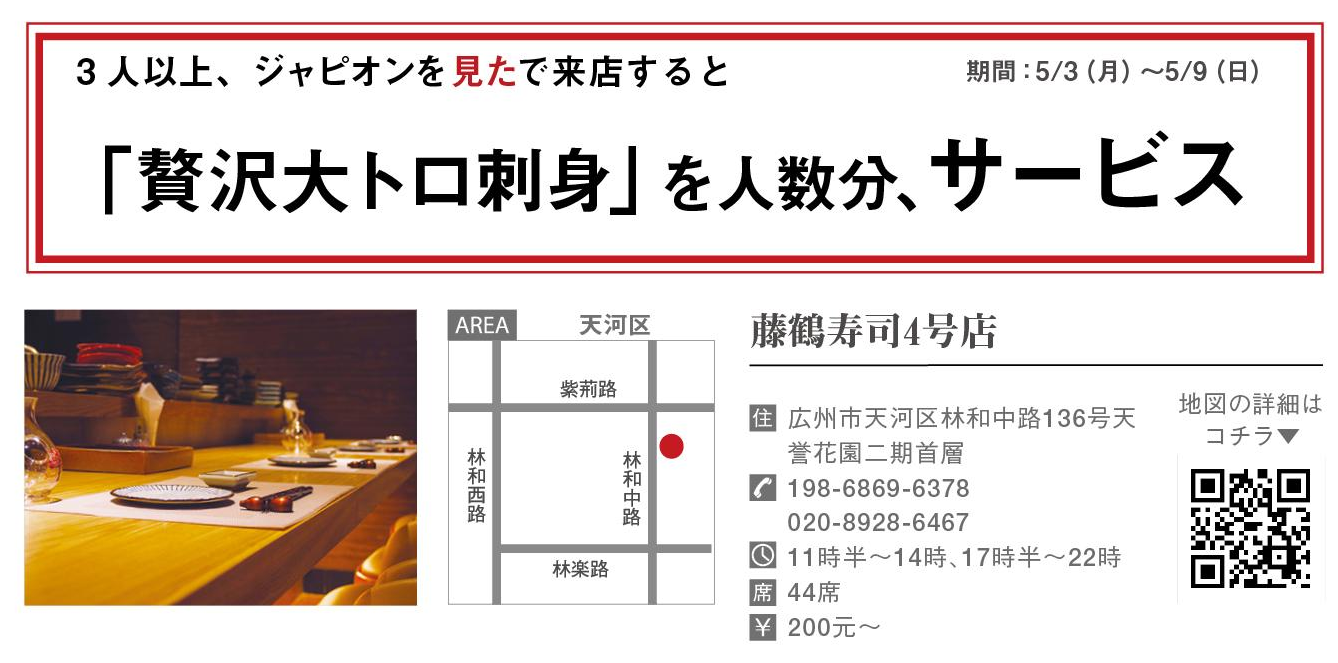 人気高級日本料理店「藤鶴寿司」の4号店が林和西路、天誉花園にオープン。「本物の和の味を多くの人に味わっていただきたい」と日本より取り寄せた厳選食材をリーズナブルに提供している。