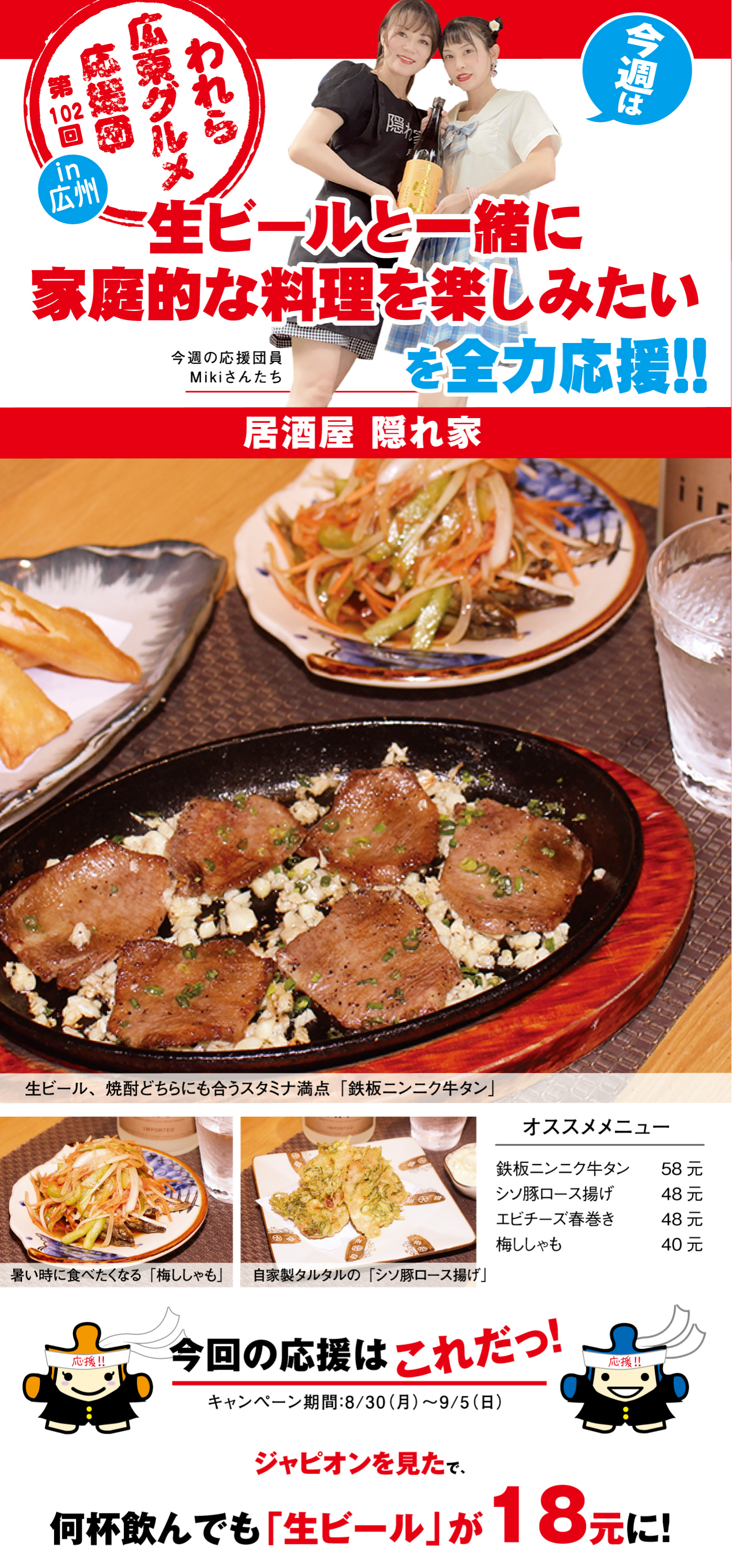 今週もやって来ました、広東グルメ応援団。今回は、居酒屋「隠れ家」が応援団に加わってくれた。