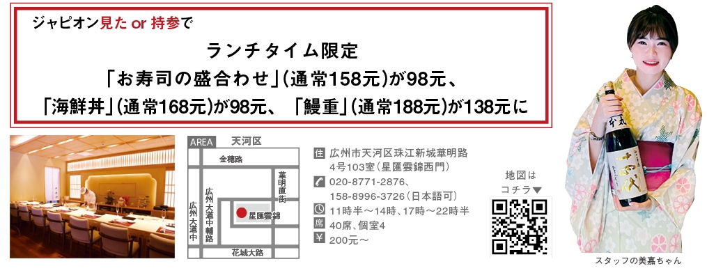 日本より取り寄せた季節の鮮魚を熟練の寿司職人が握る。11月中旬、珠江新城にあるマンション「星匯雲錦」の西門付近に颯爽と誕生した本格寿司専門店「神楽」。店内は純和風で喧騒とは無縁の落ち着いた雰囲気。個室とカウンター席が用意されており、ゆったりと食事を楽しみたい人に最適な店である。