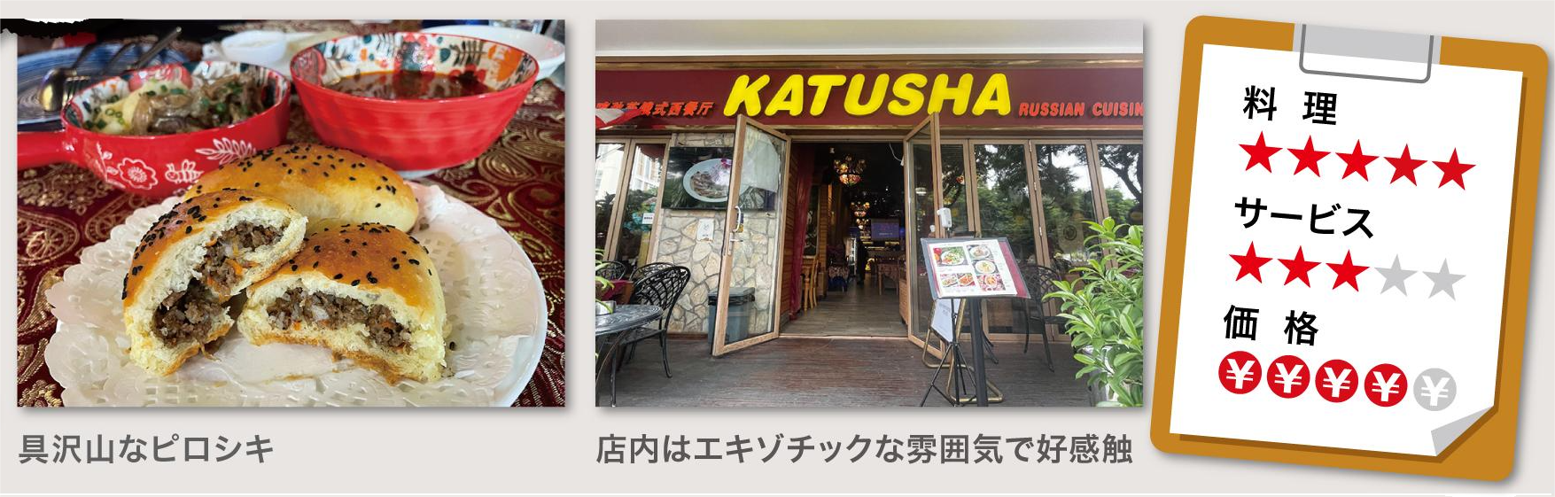 さて、そのような中で最近、ロシアに留学していた友だちが「ロシア料理は香辛料をあまり使わないかわりに、ハーブや乳製品を用いた優しい味わいでHの口に合うよ」と言っていたのを思い出し、ロシア料理モードがスイッチオン。グルメアプリ「大衆点評」で一番人気があったロシア理レストラン「喀秋莎俄罗斯西餐厅」へ旦那と行くことにしました。