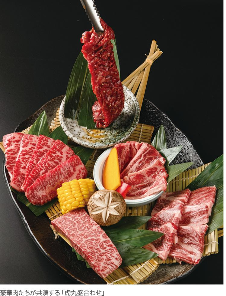 「同店に訪れたらこれを食べてほしい」と店長がオススメしてくれたのが、美味い肉が大集合でボリューム満点の「虎丸盛合わせ」(398元/500㌘)。ロングカットハラミセットと薄切りロースセットがあるので、好きなセットをオーダーしよう。