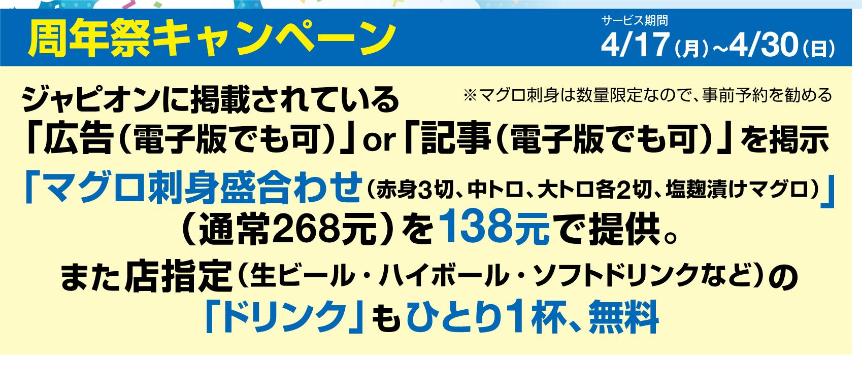 今回同店では「5周年キャンペーン」と題し、長崎産の厳選本マグロが存分に楽しめる「マグロ刺身の盛合わせ」を特価で提供している。ビールはもちろん、焼酎や日本酒に合うこと間違いなし。最高品質のマグロをお得に堪能できるチャンス。また期間中はドリンクも1杯サービス! マグロは数量限定なので早めに予約し、仲間を連れて来店してほしい。