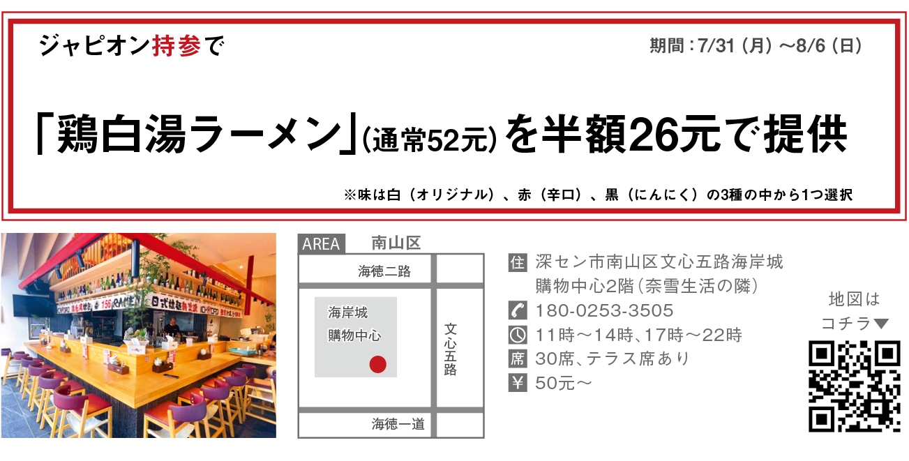 深センの人気日本料理店「蕎上人」が地下鉄「後海」駅近く、海岸城購物中心1階にラーメン店「156(ICHIKORO)RAMEN」をオープン。深センで中々お目にかからない「泡系鶏白湯ラーメン」を提供し、ラーメン通たちを唸らせている。