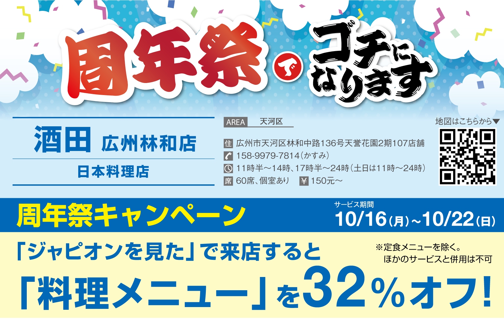 10月は広州林和西路店のオープン1周年。キャンペーン期間中は料理メニューが32%オフとなり、お得に自慢の料理が楽しめるチャンス♪ 今夜の晩酌する店が決まっていないなら、仲間を誘って、迷わず酒田に行こう。