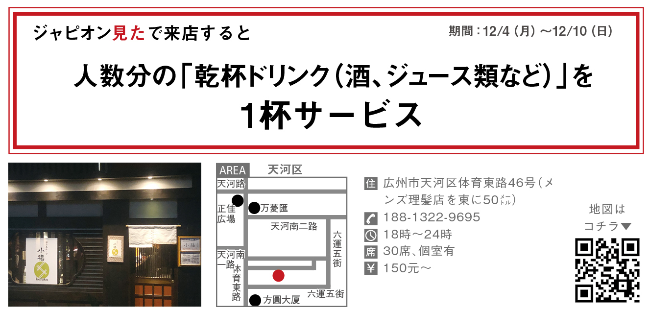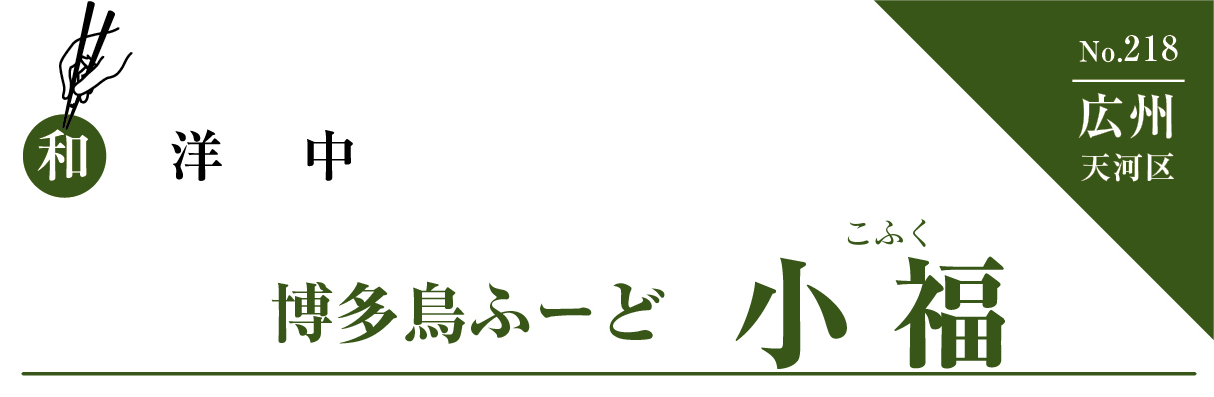 六運五街界隈に誕生した博多居酒屋「小福」。日本人親方が厨房に立ち、広東の有名地鶏「清遠鶏」の様々な部位を使って、博多鳥フードを提供する飲み処だ。同店の看板メニューは、スッキリとしながらコク深い味わいがウリの「博多水炊き」(168元/半匹、248元/匹)。鶏一匹を炊い作ったチンタンと12時間煮込んだ白湯のWスープが美味しさの秘密で、五臓六腑に沁みわたる味わいに誰もが恋をしてしまうであろう。最後はラーメンで〆てほしい。