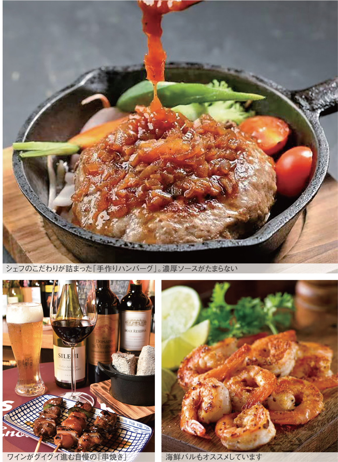 ろびんではロールキャベツ、アヒージョ、串焼きなどの洋食メニューを数多く用意。中でもイチオシにしているメニューは、肉汁たっぷり「手作りハンバーグ」。オープン当初より変わらぬ美味しさで飲兵衛だけでなくお酒が苦手な人たちは心が鷲掴み。ろびんに訪れたら、注文はマストであろう。そのほかにも自家製ダレ、オリジナル塩で焼いた「串焼き」もオススメ。厳選された黒毛和牛種を使用しており、ひと口頬張ると、旨みがジュワ~と口の中へ広がり、食べた者をハッピーにさせてくれる。