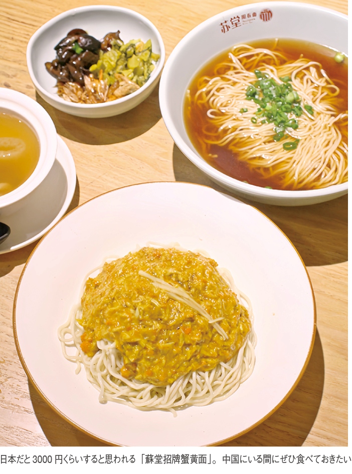またこの店では陽春面のほかにカニ味噌がたっぷり入った高級麺「蘇堂招牌蟹黄面」(98元)もオススメなんや。ひと口食べると身体中が圧倒的なカニ味噌感に支配される究極の一碗。カニ好きにはたまらないと思う麺料理だが、少し味が単調になってしまうので、シェアしながら食べるのがいいと思うで。