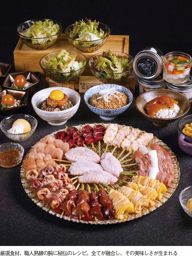 同店は契約農家より仕入れた鮮度抜群の地鶏を使用。熟練の職人が予約時間を逆算して仕込みを行っており、ゲストはいつでも最高の状態の焼鳥が楽しめる。また同店では本店より受け継いだ門外不出のタレを使っているのも特長。一度、食すれば誰しもその味の虜になること間違しであろう。