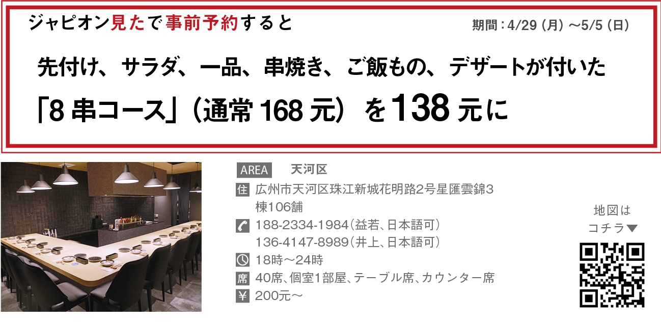 日本のグルメサイト「食べログ」の「日本の百名店・人気焼鳥ランキング」で2年連続第1位に輝いた「熊の焼鳥」の広州店が店名を「熊の焼鳥Jr.」に変え、リニューアルオープン。味とサービスはそのまま、よりお手頃価格でこだわりの焼鳥が楽しめるようになった。