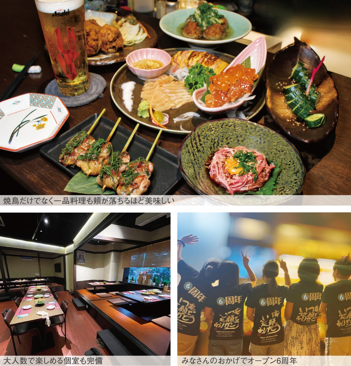 珠江新城、星匯雲錦にオープンしている日本料理店「鳥かく」がオープン6周年を迎えた。同店は朝締めした広東の地鶏「清遠鶏」を使用、熟練の料理人が丁寧に焼き上げた絶品焼き鳥を楽しめる本格炭火焼き鳥専門店。日本語が話せるキュートなスタッフがもてなしてくれるので、お1人様や中国語が苦手な人でも気軽に来店できる。またサークルや県人会など、大人数の宴会に対応可能な個室を完備しており、打ち上げなどに利用しやすいのもうれしい。