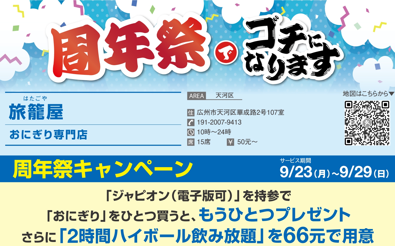 珠江新城、華成路界隈にオープンしているおにぎり専門店「旅籠屋」がオープン1周年を迎えた。同店はふっくらと厚みのあるジャポニカ種東北米を使用し、日本人も納得の味わいを再現。おにぎりを作るスタッフは日本人料理人より指導を受けているので、日本のおにぎり専門店にも負けない味わいを実現している。