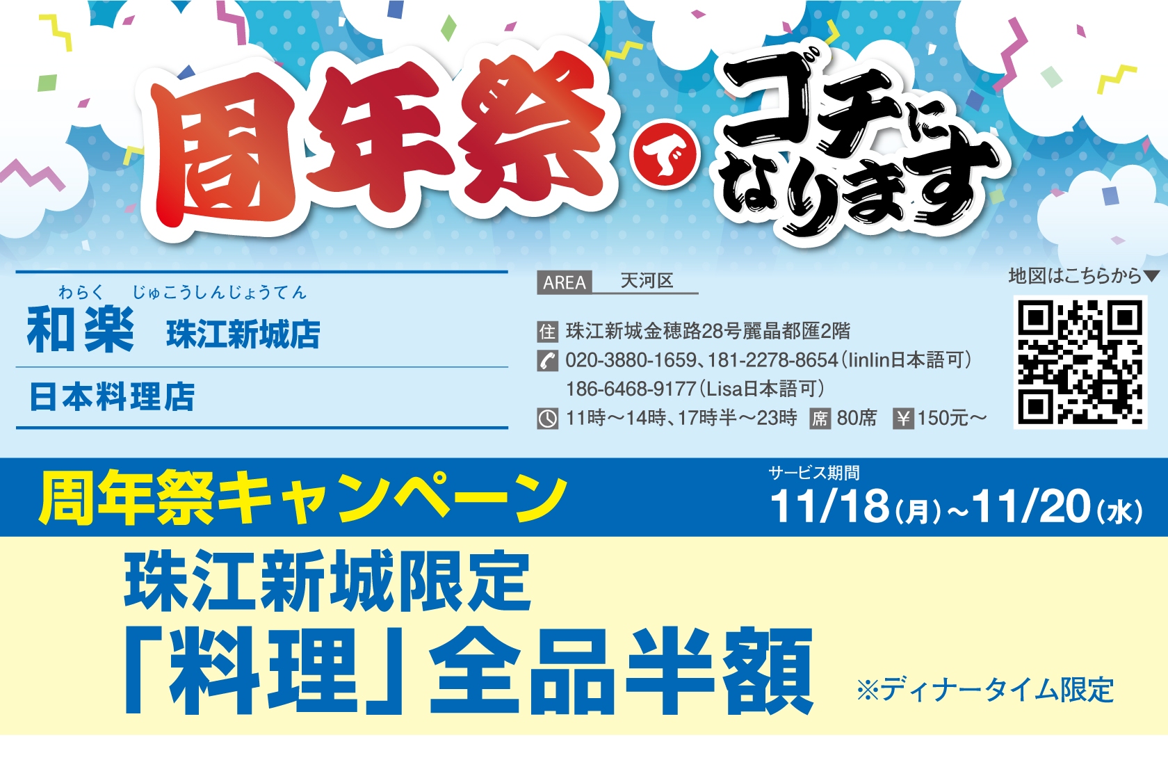 この道十数年の料理人が腕を振るい、本格的な日本料理が楽しめる「和楽」の珠江新城店がオープン1周年を迎えた。同店はテーブル席だけでなく、個室も完備していて、大人数の宴会などに持ってこいの飲み処だ。また日本語が話せるスタッフもいるので、中国語が苦手な人も気軽に来店できる。