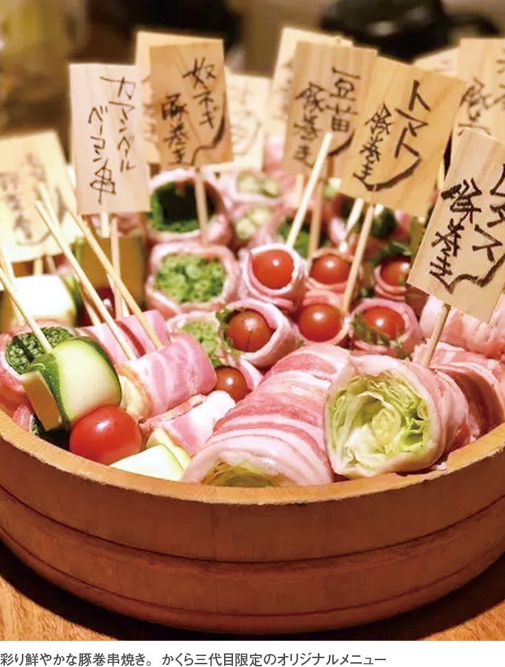 さらに3号店では、新鮮な野菜に豚バラ肉などを巻いて焼く「博多風豚巻串焼き」をイチオシしている。見た目からもその美味しさが伝わる豚巻串焼きはビール、サワー、日本酒、どの酒にもマリアージュする逸品。思った以上にヘルシーでついつい何本も食べてしまうので食べ過ぎ注意かも?