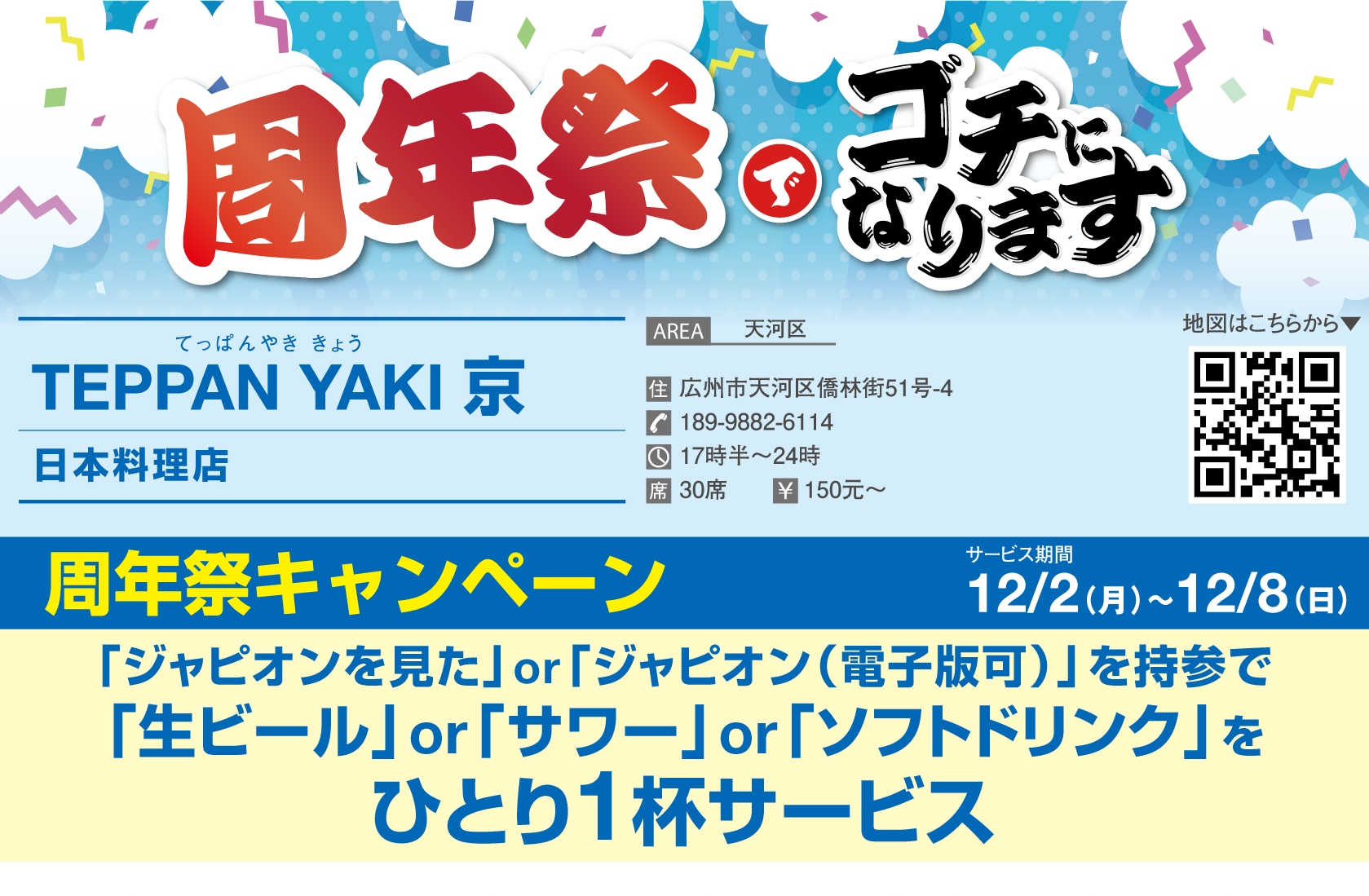 京都出身の料理人が監修、広州の隠れ家的関西風鉄板焼き店「TEPPAN YAKI 京」がオープン1周年を迎えた。同店はこぢんまりとした簡素な造りで2階に個室を完備。少人数でまったりと酒を楽しみながら、料理をつまみたい人にはピッタリな飲み処だ。