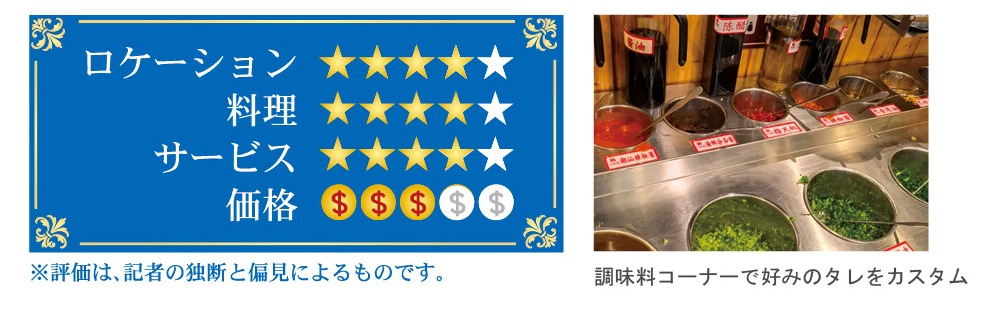 またこの店は牛肉のクオリティも高く、「嫩肉(ランプ)」、「吊龍(サーロイン)」、「五花肉(バラ)」といった部位の肉はどれも美味しいと思うわ。それに野菜や豆腐など具材の種類も豊富で、栄養バランスの良い食事が楽しめるで。あと忘れちゃいけないのが締めに楽しむ鍋スープ。牛肉や野菜の旨味がしみ出たスープは絶品で「これを飲むために具材を食べている」と言っても過言ではないほどの美味しさ。みんなも行った時は絶対に薬味を入れて、鍋スープを楽しんでや~。