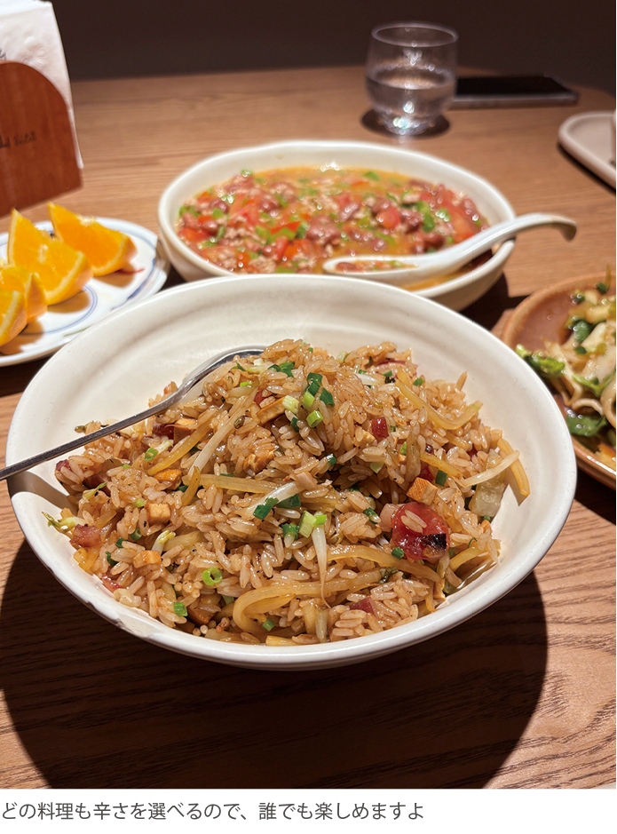 人気店というだけあって、内装はとてもオシャレ。ローカル感が全くなく、気軽に食事ができるような雰囲気でした。さて、私が注文したのはヘルシーそうで食べたことがないメニュー4品。細長い筍と薄切り貝の和え物「双笋响油螺片」(48元)はピリ辛でサッパリとした冷菜。ご飯にもビールにも合う一品です。また貴州風チャーハン「黔山怪噜飯」(28元)はもやしがアクセントになってシャキシャキの食感を生み出しています。「不辣」も選べるので、子どもや辛いのが苦手な人でも大丈夫です。またチャーハンのお供にピッタリな「青椒肉末烩豆米」(38元)は少しピリ辛風味。青椒、ひき肉、豆が入った中華風チリコンカンのような料理でした。チャーハンにかけて食べましょう。さらに中華風茶碗蒸し「芙蓉蒸水蛋」(18元)のような辛くないメニューもたくさんあるので、子どもと一緒に行きやすいのもうれしいですね。