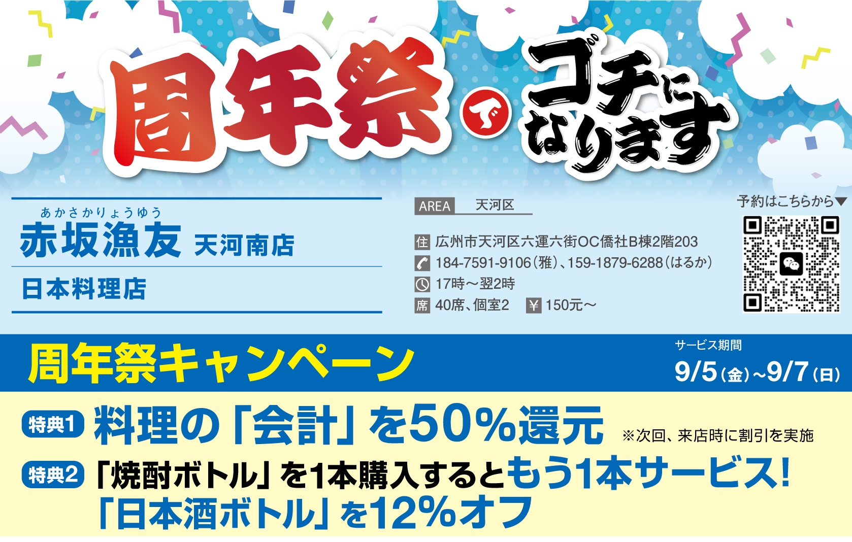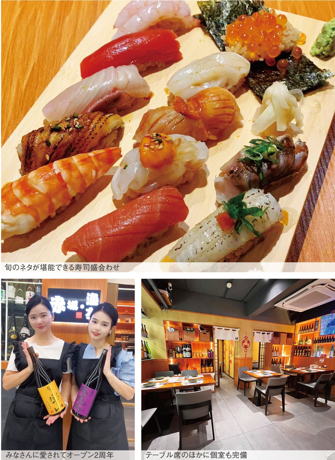 天河南二路界隈にある人気日本料理店「赤坂漁友」の2号店がオープン2周年を迎えた。同店はカウンター席、テーブル席だけでなく個室も完備。最大12人が入室可能で、コース料理も用意しており、歓送迎会の会場としてよく重宝されている。