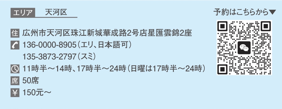 同店ではオリジナル一品料理が多いのが特徴。ビールやハイボールが進むボリューム満点「最強美味しい! 鳥のから揚げ」(48元/皿、15元/個)やオリジナルつくねをアッサリだしの中に入れた「つくね君」(49元)に隠れ人気メニュー「きゅうり1本漬け」(22元)など、焼き鳥専門店ならではの創作メニューがいっぱいで、ゲストの心を鷲掴みしている。また看板メニューの焼鳥も絶品。同店では朝締めにした広東の地鶏「清遠鶏」を使用しており、新鮮でプリプリ、ジューシーな鶏肉が楽しめるのがウリでヤミツキになること間違いなしだ!