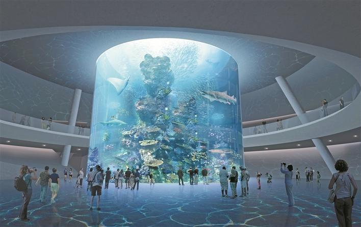 新たなテーマパークの目玉スポットは高さ11㍍、直径15㍍、容積6万2280・8㎥の世界最大の水槽「青い洞窟」。10万匹のイワシが泳ぐ水槽にプロジェクションマッピングが融合し、海洋生物と音と光の新世界に浸ることができるという。(12月1日)