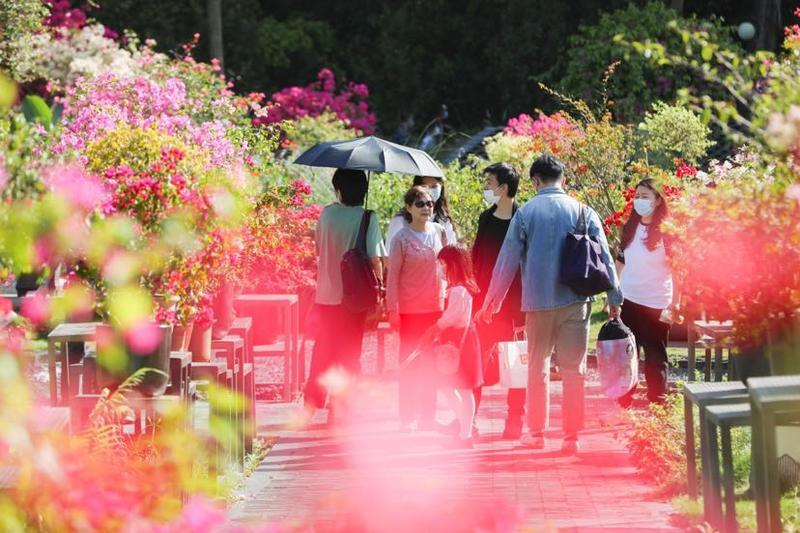 連休中の天気は快晴。公園の草木や花々は満開で、絶好の行楽日和となった。臨時バスの運行やコロナ対策も万全に行われる中、市民は写真撮影、日光浴、テントを張ってピクニックをする等、思い思いの方法で春の休暇を楽しんでいた。(4月6日)