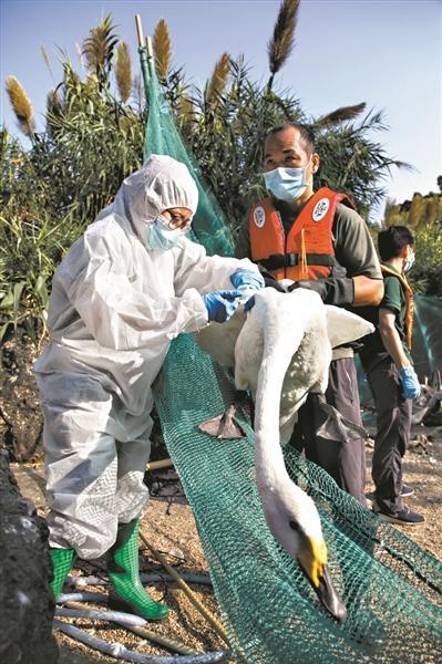 園内中央の三大湖ワクチン接種場では、作業員が防護服を地着用して準備。静かな湖面に小船数艘が現れると、歩調を合わせて鳥たちを湖西南側へ追い込み、丹頂鶴、白枕鶴、フラミンゴ、ペリカン、ハクチョウ、オシドリ等24種370羽に作業員がワクチン接種した。飼育員は網を手繰り寄せた後、羽をばたつかせる鳥を素早く捕まえ、獣医は阿吽の呼吸で手早くワクチンを接種していた。(11月7日)