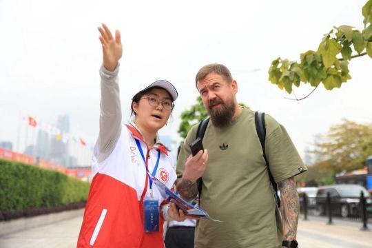 ボランティアスタッフは午前中は入館手続きのサポート、午後は交通案内を実施。通訳専門のボランティアチームもあり、様々な言語に対応する157人が中山大学、広東外語外貿易大学等から招集され、研修を受けている。(4月17日)