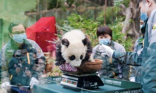 広州市の長隆野生動物世界で、世界で類を見ない三つ子パンダの長女「萌萌」の娘である「妹猪」が生後半年を迎えた。妹猪の生誕半年を祝う誕生会では、飼育員が身体測定を行い、体重10.88㌔、体長65㌢、尻尾の長さ9・5㌢、乳歯24本で、健康状態良好と確認された。