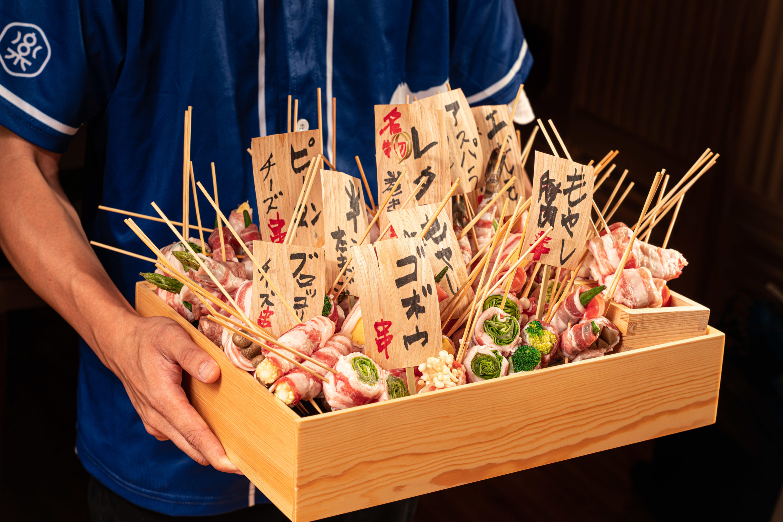 同店は、野菜や玉子などを豚バラ肉で巻いた博多名物の豚巻串専門店。「玉子チーズ豚肉巻き」(15元/串)や「キムチレタス豚肉巻き」(12元/串)などの豚巻き串を豊富に用意。そのほかにも酒に合う一品料理を数多く取り揃えている。